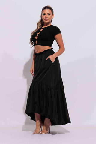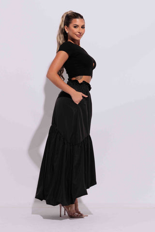 Elevate your style and convenience with our Shirring Maxi Skirt with Pockets. This elegant skirt features shirring detailing and practical pockets, creating a flattering and versatile look that's perfect for a range of occasions, from casual outings to semi-formal gatherings.